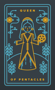 錢幣皇后牌描繪了一個美麗的女人坐在一個裝飾的寶座上,手裡拿著一枚金幣。圍繞著她的是美麗的開花樹木和綠色的花圃。她的寶座上裝飾著各種大地的野獸,將她與自然和豐收緊密聯繫在一起。在牌的底部右側,一隻兔子正