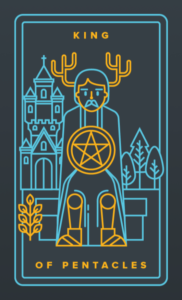 錢幣國王指的是一個野心勃勃、物質滿足和世俗成功的人。錢幣國王坐在一個裝飾著葡萄藤和公牛雕刻的寶座上,他身上的長袍繡著許多葡萄藤的圖像。他看起來很成熟,很有威嚴。他的周圍還有不同類型的植物、藤蔓和花朵,
