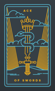 寶劍A顯示一隻手從雲中出現,揮舞著一把雙刃劍。這把雙刃劍帶著一頂金冠,被一個花環環繞著。長期以來,花環一直與勝利、成功和偉大的成就有關。 王冠被用作皇室和皇室所帶來的統治權力的象徵。 在前景的後面,劍