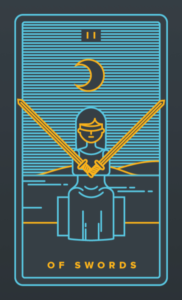 寶劍二象徵著我們在被迫做出艱難選擇時面臨的困惑。在寶劍二牌中,有一個坐著的女人,她被蒙著眼睛,雙手各拿著一把劍。在背景中,有一個大海,周圍有峭壁和岩石,作為船隻和船舶的障礙,阻礙了前進和行動。牌中被蒙