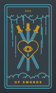 作為塔羅牌中最有代表性的圖像之一,寶劍三顯示了一顆漂浮的心,被三把劍刺穿。上面有厚厚的雲層。背景中也有一場大雨。象徵意義是相當不透明的,而它的情感效果是直接的。心臟是溫暖、感情和精神的所在,而三把劍表