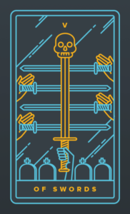 寶劍五這張牌描繪了一個年輕人,他的臉上有一種非常方便的輕蔑表情。他正看著自己成功征服的敵人。他擁有五把劍──這是他從牌中的其他戰鬥人員那里奪來的。另外兩個人物正以緩慢的方式從他身邊走過,帶著一種失落和