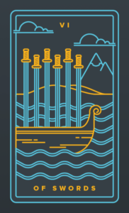 寶劍六的圖像顯示,一個女人和一個孩子在水中被劃到另一邊的陸地上。我們可以從圖像中得出結論,這個女人和孩子正在留下什麼東西,因為他們的背對著我們。女人的頭被斗篷遮住了──也許她在逃離什麼,而且必須在別人