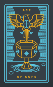 在聖杯王牌中,有一隻手從雲層中伸出來,拿著一個杯子,似乎是在向牌主提議喝水。這只杯子裡溢出了閃亮的水,象徵著純潔和質樸的情感。如果你接受這個提議,喝下這杯水肯定會給你帶來情感和精神上的滿足。 杯子有五