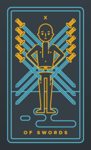 這是另一張牌中最醒目和不祥的牌,寶劍十顯示一個人平躺在地上,臉朝向泥土。他從胸部到腿部都被一塊紅布所覆蓋。十把長劍刺入他的背部,他可能沒有看到這個結局。空氣中瀰漫著可怕的寂靜:他頭頂上的天空是黑色的,