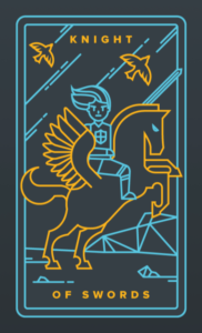 我們看到這位騎士是多麼的匆忙啊! 寶劍騎士這張牌描繪了一個身穿盔甲的年輕人,騎著一匹強壯的白馬進入戰鬥之中。他的馬的白色是指整體的純潔和智慧的能量,激勵著這位年輕的騎手。他身後的天空有暴風雨般的雲彩,