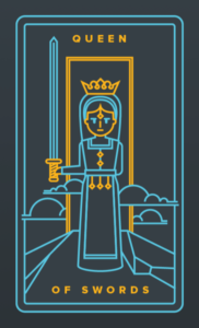 寶劍皇后坐在高高的寶座上,帶著嚴厲的表情--向遠方眺望。作為劍所代表的空氣元素的女王,她在雲中的位置表明沒有人可以欺騙或愚弄她。她右手中的劍指向天空,而左手則伸出來,像是在提供什麼。寶劍皇后給了我們判