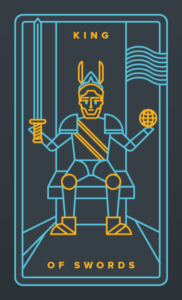 塔羅牌中的寶劍國王顯示一個坐在寶座上的國王,而他的右手拿著一把向上的雙刃劍。寶劍國王散發出智慧的力量、清晰的思維、真理和權威。他明白權力意味著巨大的責任。 國王穿的藍色外衣是他精神理解的象徵。他的寶座