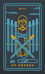 在寶劍八上是一個被捆綁和蒙住眼睛的女人。有八把劍戰略性地放在她周圍,限制了她的行動,好像她在某種陷阱或監獄裡。然而,似乎建造陷阱的人有點懶惰或草率,留下了一些她可以逃脫的空隙。但是,由於蒙住了眼睛,使