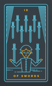 寶劍九描繪了一個女人坐在床上,雙手抱頭。 似乎這個女人剛剛從一個非常糟糕的噩夢中醒來。 她似乎很沮喪,焦慮和恐懼。 她的牆上掛著九把劍,床上還刻有一個人被另一個人打敗的雕刻。 被子上裝飾著各種星座符號