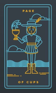 聖杯使者代表的是來自無意識的意外靈感,也許是以我們可能無法真正理解的方式。在這張牌中,一個在海邊的青年穿著一件藍色的外衣,上面裝飾著花紋,拿著一個金杯。她還戴著一頂看起來很波西米亞的貝雷帽,以及一條飄
