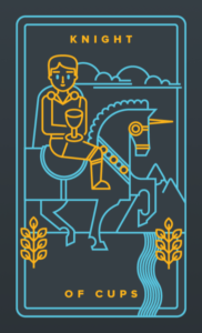 聖杯騎士這張牌描繪了一個年輕的騎士,他光榮地騎著一匹白馬,同時拿著一個杯子,好像他是某種信使。與權杖騎士或寶劍騎士不同的是,這位騎士並沒有騎著馬衝鋒陷陣。相反,他正緩慢地向前移動,這為整個環境提供了一