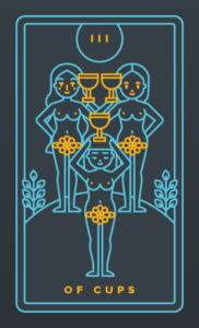 當你抽到聖杯三的時候,你會看到三個女人將她們的杯子舉到空中,進行某種慶祝。空氣中瀰漫著美好的時光,因為這三位女士的頭髮上戴著花環。花環通常與成功和勝利有關,所以她們的幸福是當之無愧的。這三位女士還站在