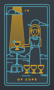聖杯四顯示一個年輕人坐在山頂的一棵樹下,遠離他人。他似乎在沉思和冥想。在他面前有三個杯子躺在草地上,而另一個杯子被一隻手放在空中提供給他。這個人手腳交叉,低頭看著這三個杯子,不為所動,以至於他看不到那