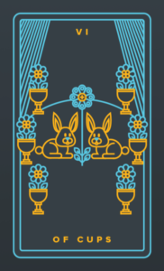 聖杯六象徵著懷舊的喜悅,家庭的舒適和童年的純真。牌中有六個杯子,裡面裝滿了白花。前景中描繪了兩個孩子,其中一個正把杯子遞給另一個。男孩把花遞給女孩,顯示了傳統的傳遞和快樂的團聚。孩子們似乎在一個類似於