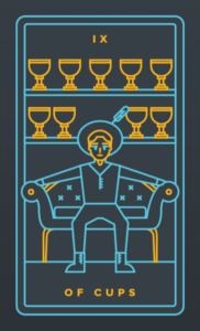 在這張牌中,一個中年男子坐在木椅上,雙臂交叉,臉上流露出相當的滿足感。他穿著優雅,有一種真正的滿足感。他頭上的頭飾是紅色的,是他活躍思維的寫照。在他的背景處,你會發現有九個金杯,結構有序,排列整齊。聖