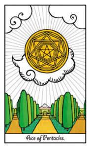「ペンタクル・エース」は、小アルカナの中で最もエネルギーの強いカードと言われています。絵空事を語ってかすみを食べる生き方は現実的ではありません。ペンタクルは金銭的なことや肉体など、現実的に生きることを