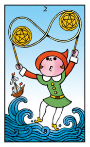 「ペンタクル・エース」で幸運のタネを掴んだ次のステージでは、無限大マークの形をしたロープでジャ グリングをする若者が現れます。彼が回しているのはふたつのペンタクルです。ペンタクルをくるくる 器用に動か