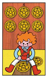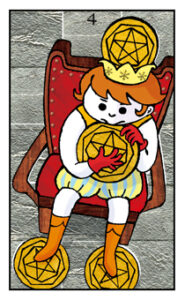 「ペンタクル 3」で手に職をつけた後は、そこで築いた作品の守りに入ります。ペンタクルを大事そうに抱え込んでいる人は、その身なりから資産家であることがうかがえ、これまで培ってきたものを懸 命に保持しよう