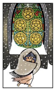 「ペンタクル 4」で守ってきた財産に執着し過ぎたため、すべてを失ないかけた状態です。寒い雪の 夜に、教会の前を貧しい女性とその子どもが彷徨っています。子どもはお腹を空かせていますが食べる ものがありま