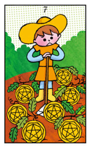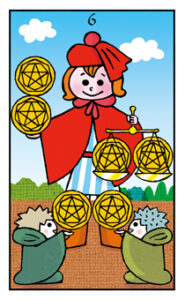 「ペンタクル 6」での慈善活動をもっと良くするためにはどうしたら良いか、試行錯誤の時が来ました。 絵の中の農夫も、実った作物が思うような出来映えでなく不満気にしています。作物は大きな実をつけ立派に見え