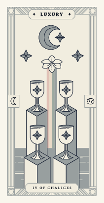 當從「聖杯三」過渡到「聖杯四」時,情緒獲得一種穩定。這裡有舒適,但在這種舒適中,事情也變得固定。現在,激情已經減退,你已經征服了你覺得是我們最大的目標,你現在可能會把生活中的快樂視為理所當然。雖然穩定對於某些牌組來說可能是強大的,但代表水的聖杯牌組卻不是這樣。為了讓水保持新鮮和清澈,它需要不斷流動。一個停滯不前的水池最終會變得污濁。